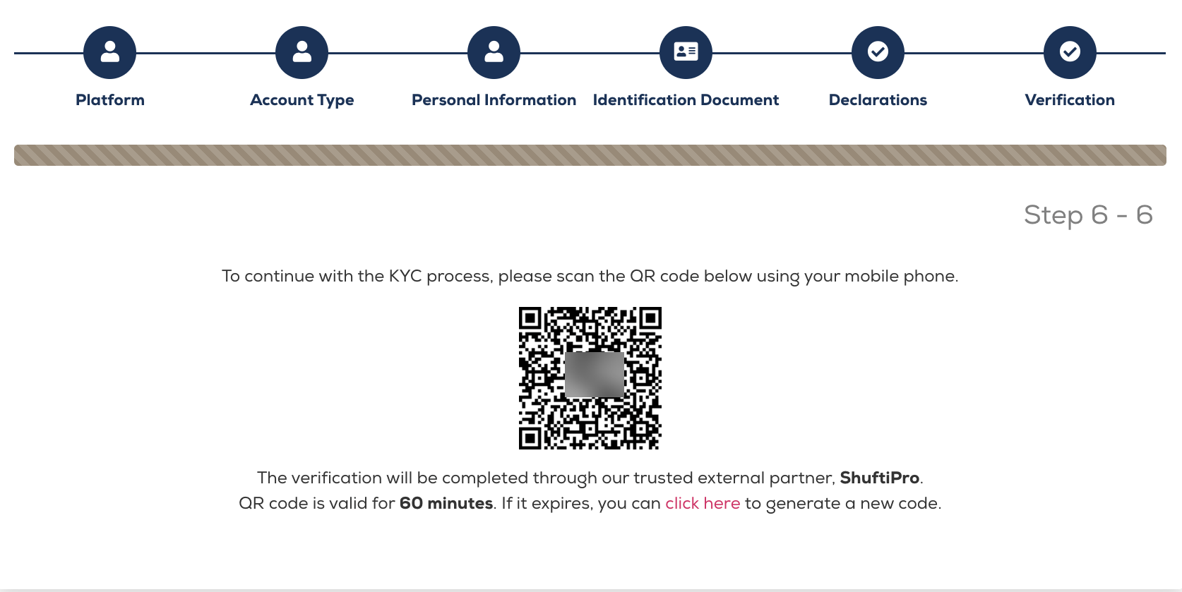 To proceed, scan the QR code using your mobile device. This will open the secure ShuftiPro application in your web browser. Please follow the on-screen instructions to complete the verification process.